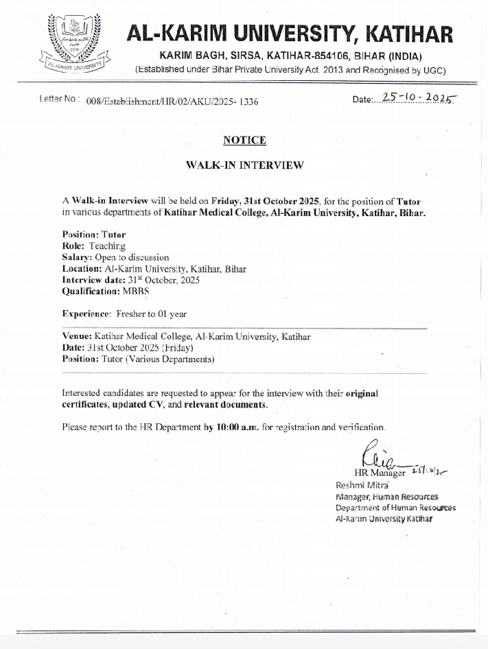 A Walk-in Interview will be held on Friday,31st Octotrer 2025, for the position of Tutor in various departments of Katihar Medical College, Al-Karim University, Katihar, Bihar.