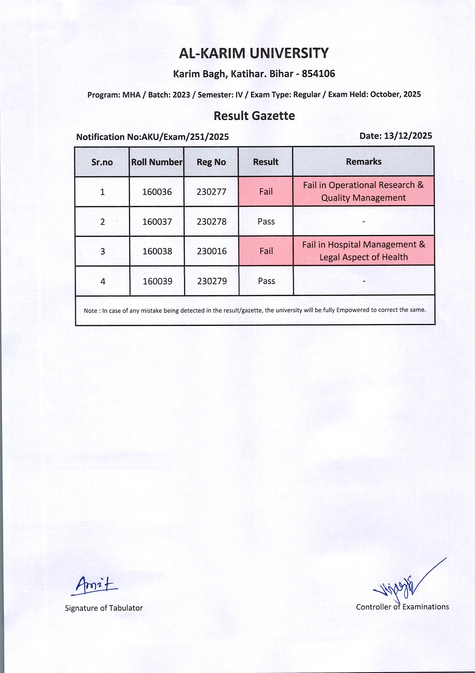 Result of MHA Batch:2023, Semester-IV Regular Examination 2025