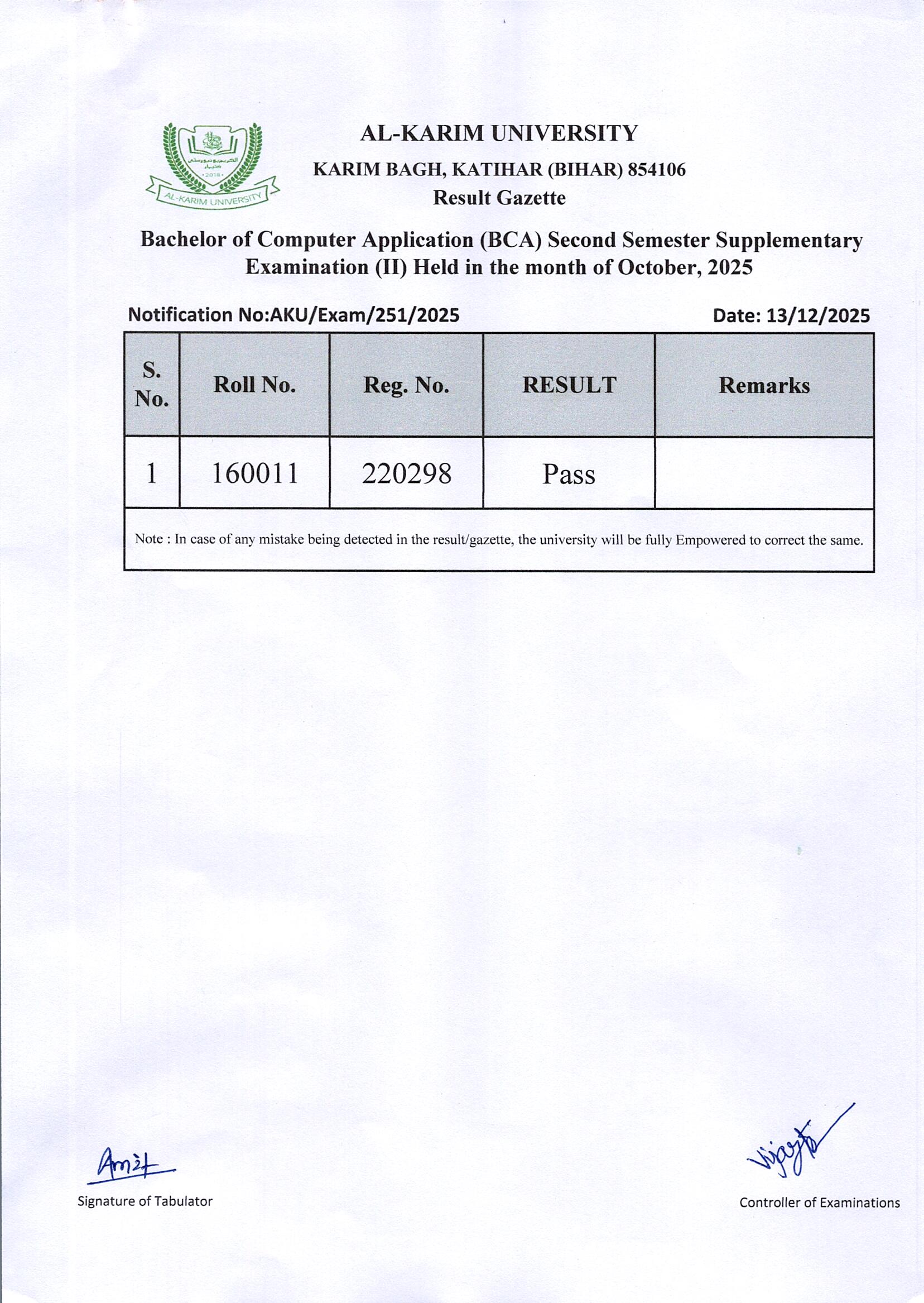 Result of BCA Batch:2022 Second Semester Supplementary Examination (II) 2025