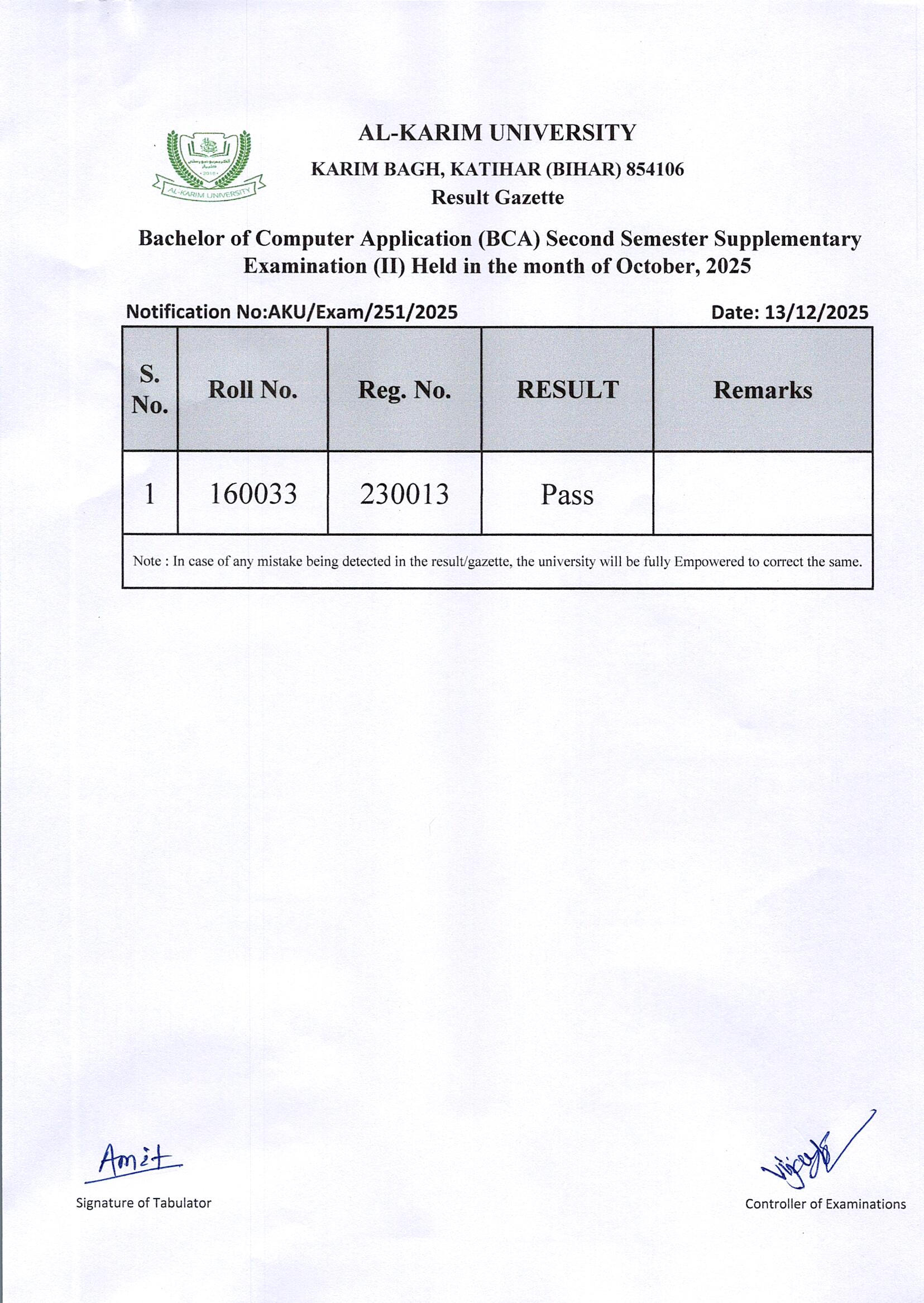 Result of BCA Batch:2023 Second Semester Supplementary Examination (II) 2025