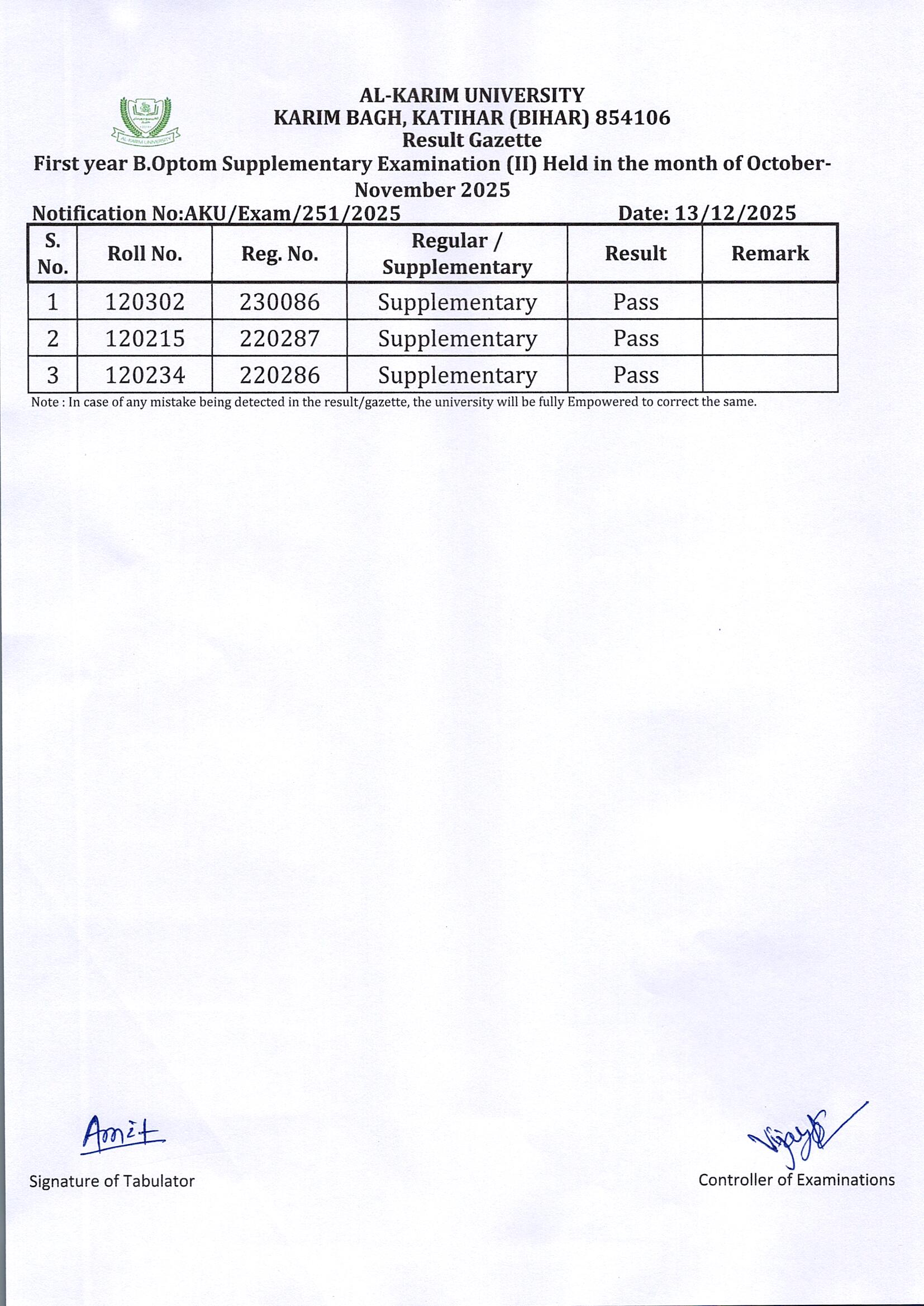 Result of First Year B.Optom. Supplementary Examination(II) 2025
