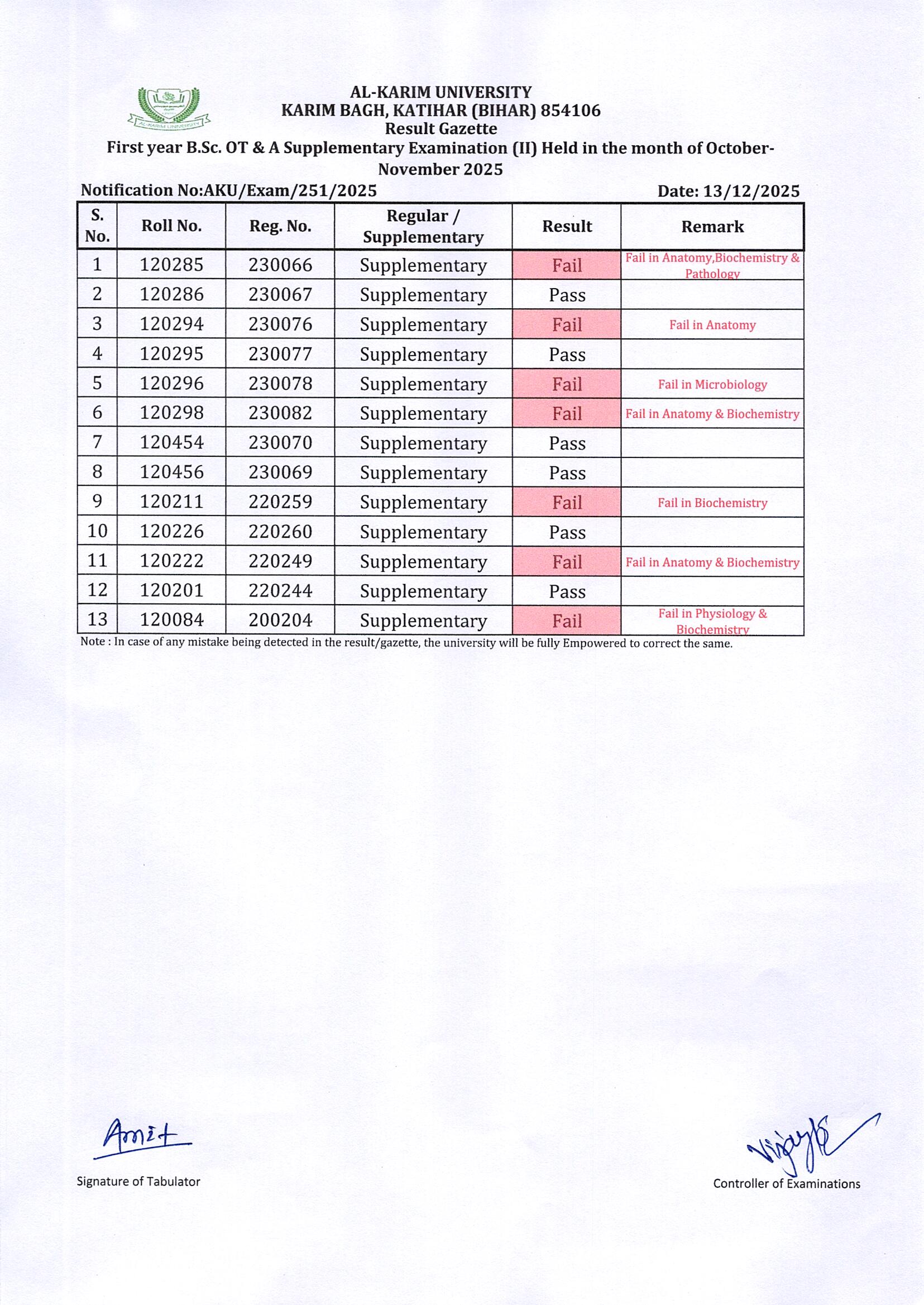 Result of First Year B.Sc.OT&A Supplementary Examination(II) 2025