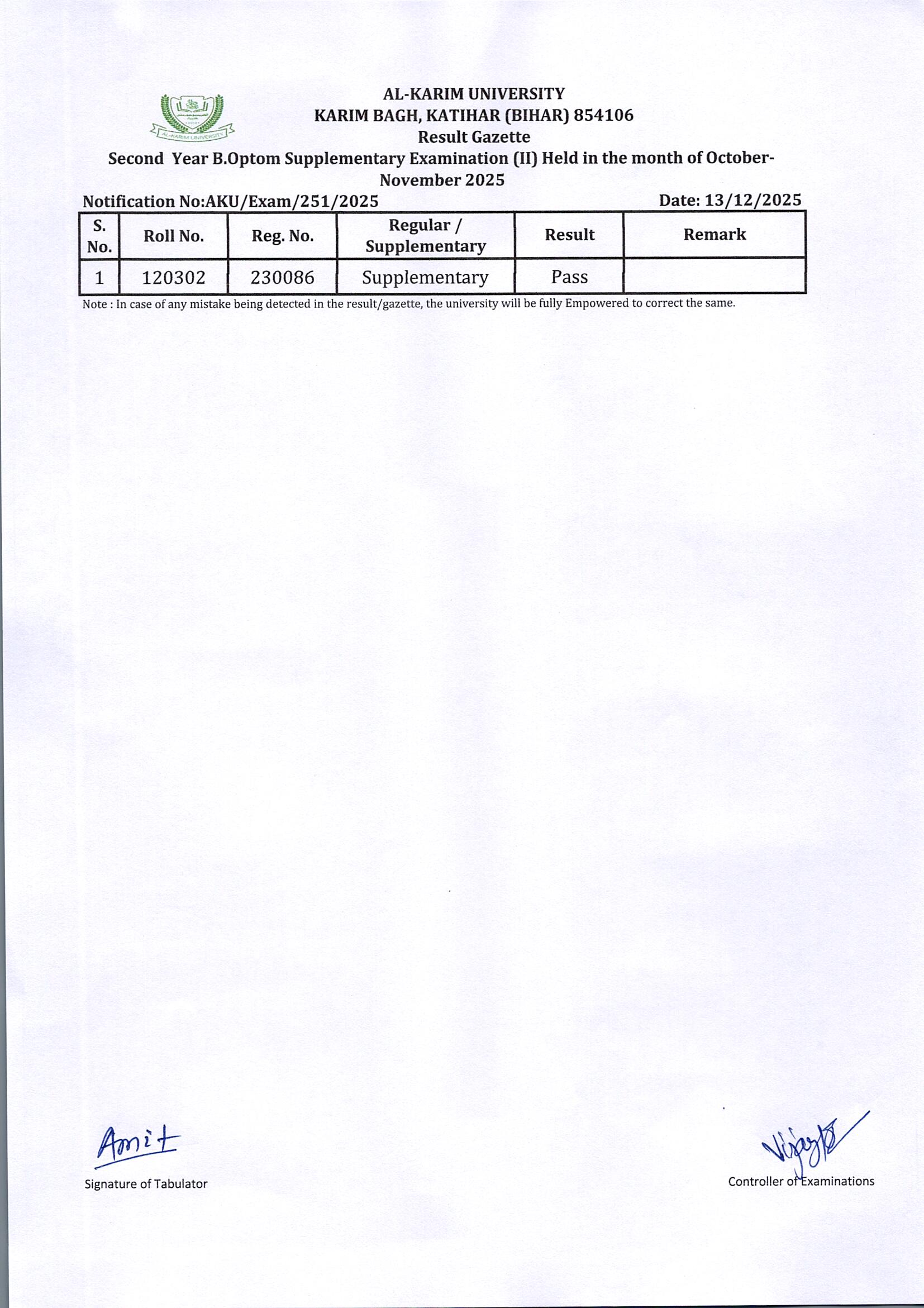 Result of Second Year B.Optom. Supplementary Examination(II) 2025