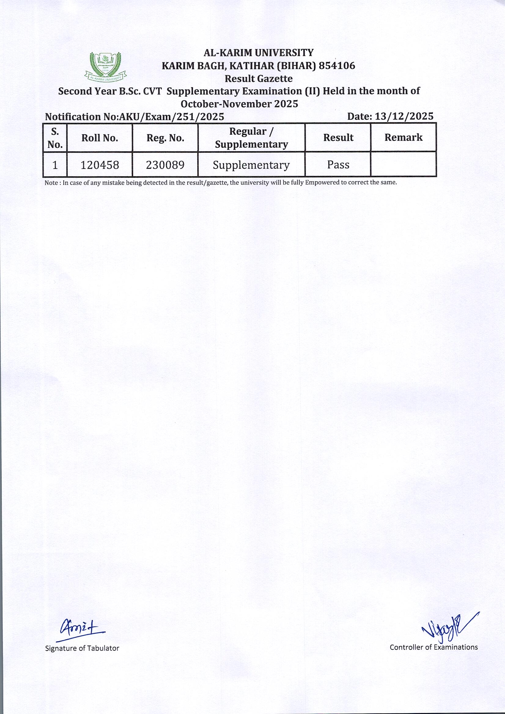 Result of Second Year B.Sc.CVT Supplementary Examination(II) 2025