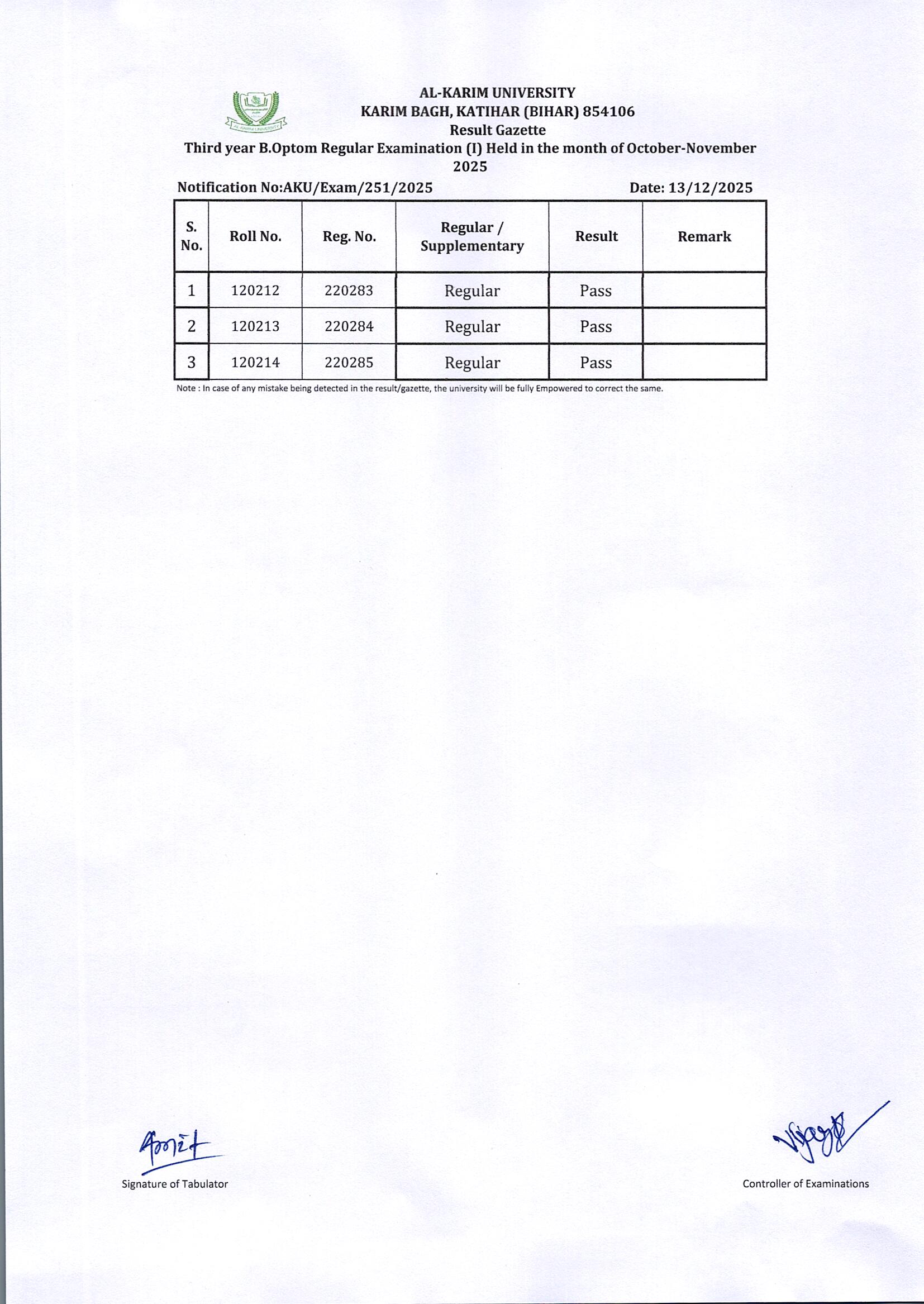 Result of Third Year B.Optom Regular Examination(I) 2025