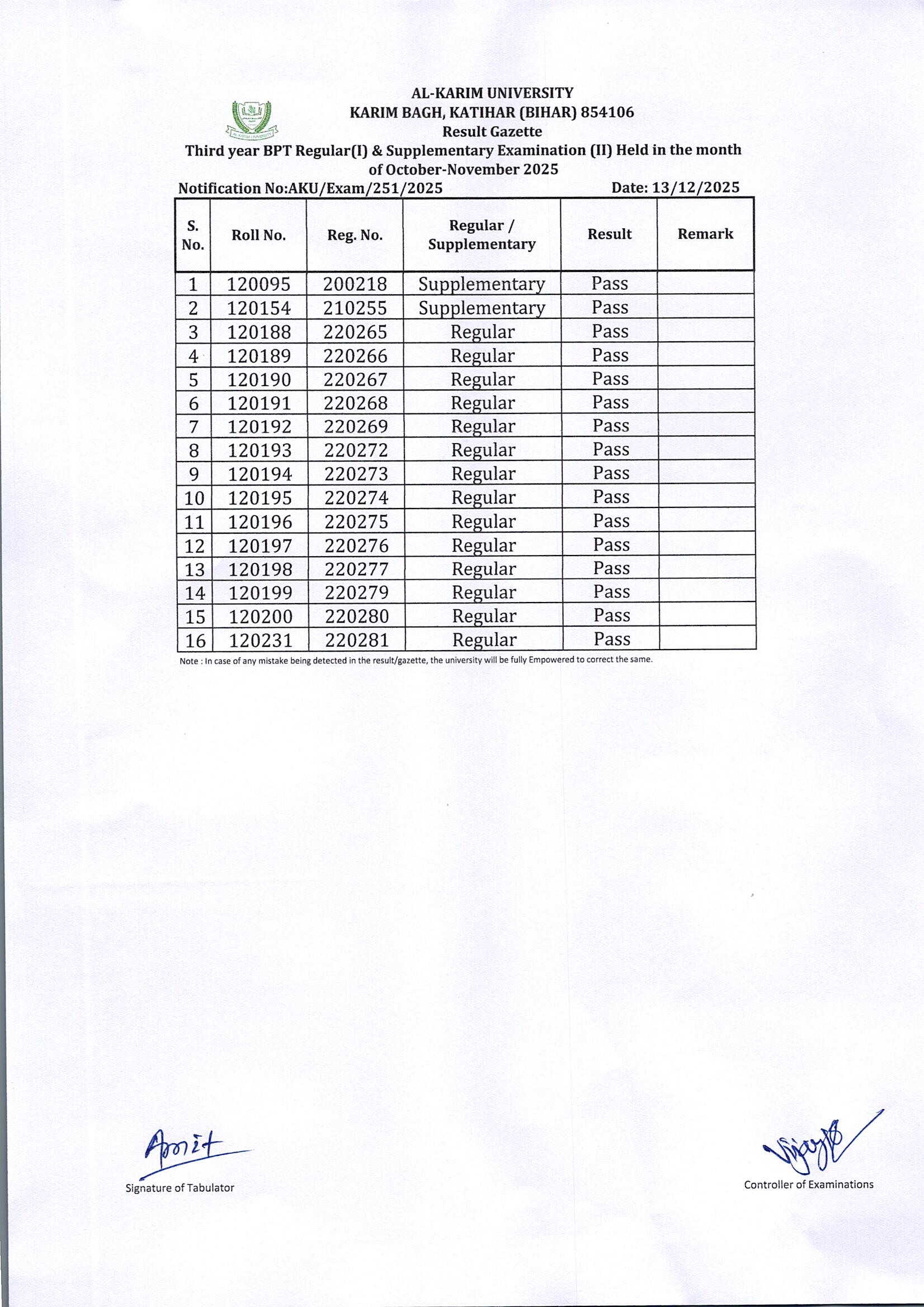 Result of Third Year BPT Regular Examination(I) 2025