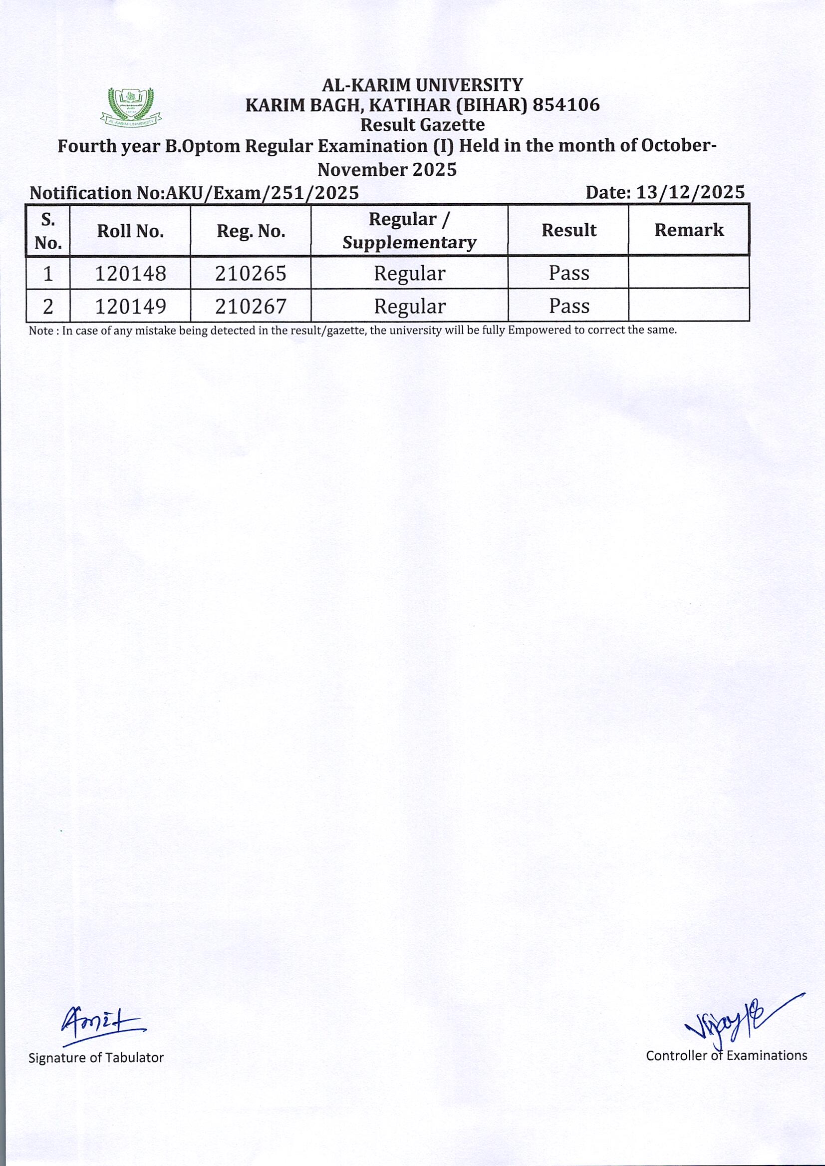 Result of Fourth Year B.Optom Regular Examination(I) 2025