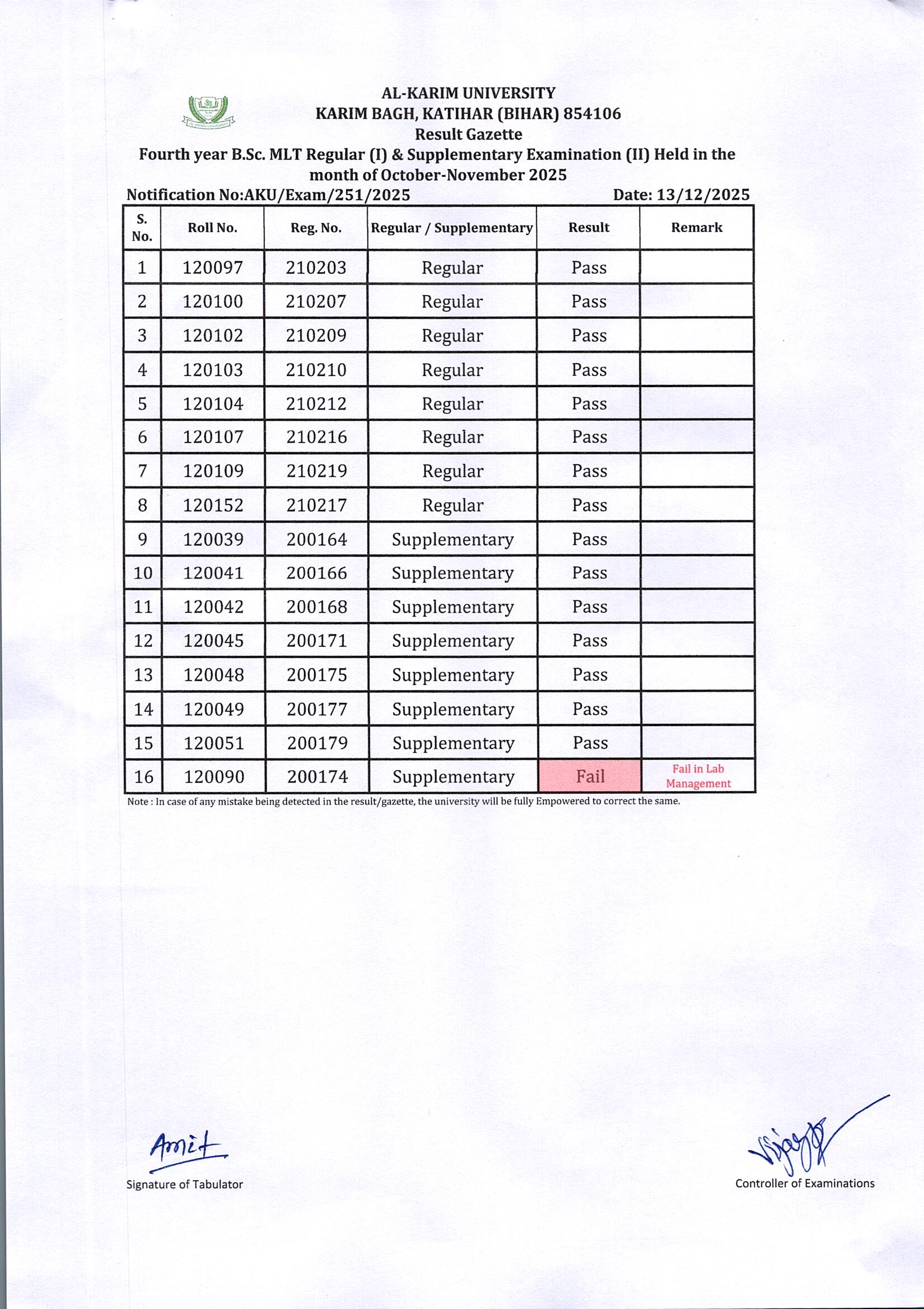 Result of Fourth Year BMLT Regular Examination(I) 2025