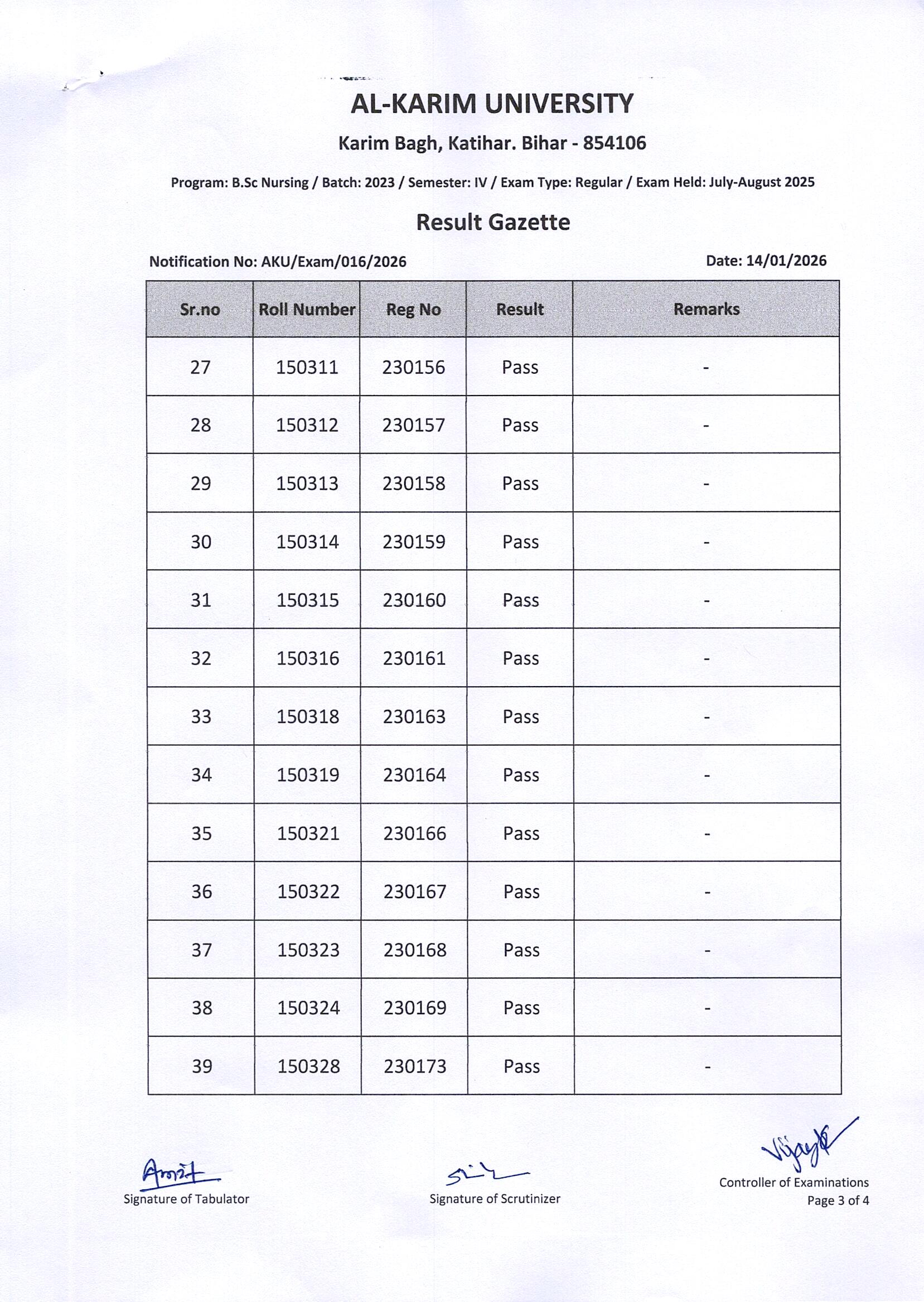 Result of B. Sc. Nursing/Batch-2023/Semester-IV Regular Exam 2025 Page 3 of 4