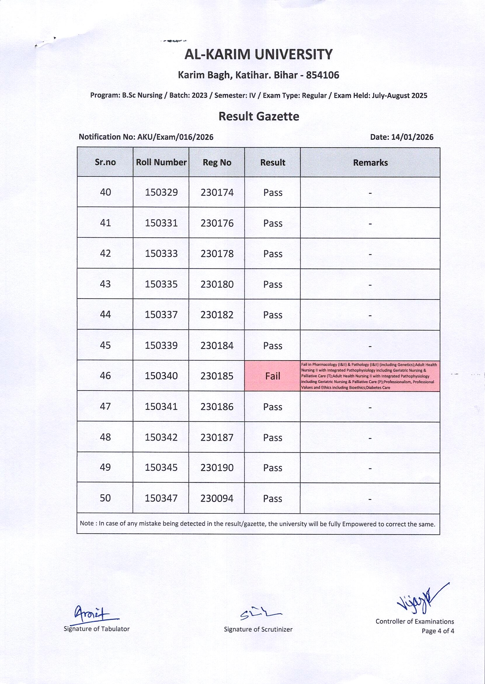 Result of B. Sc. Nursing/Batch-2023/Semester-IV Regular Exam 2025 Page 4 of 4