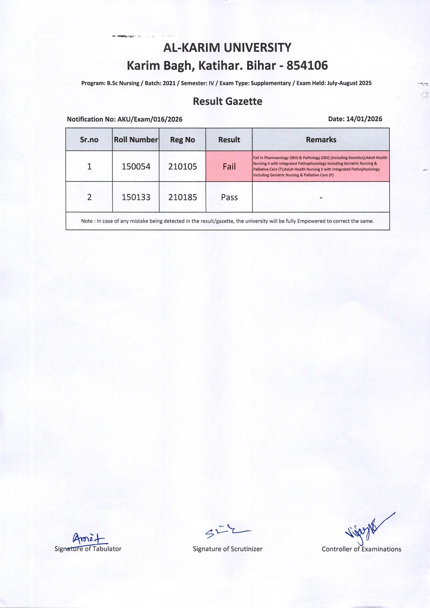 Result of B. Sc. Nursing/Batch-2021/Semester-IV Supplementary Exam 2025