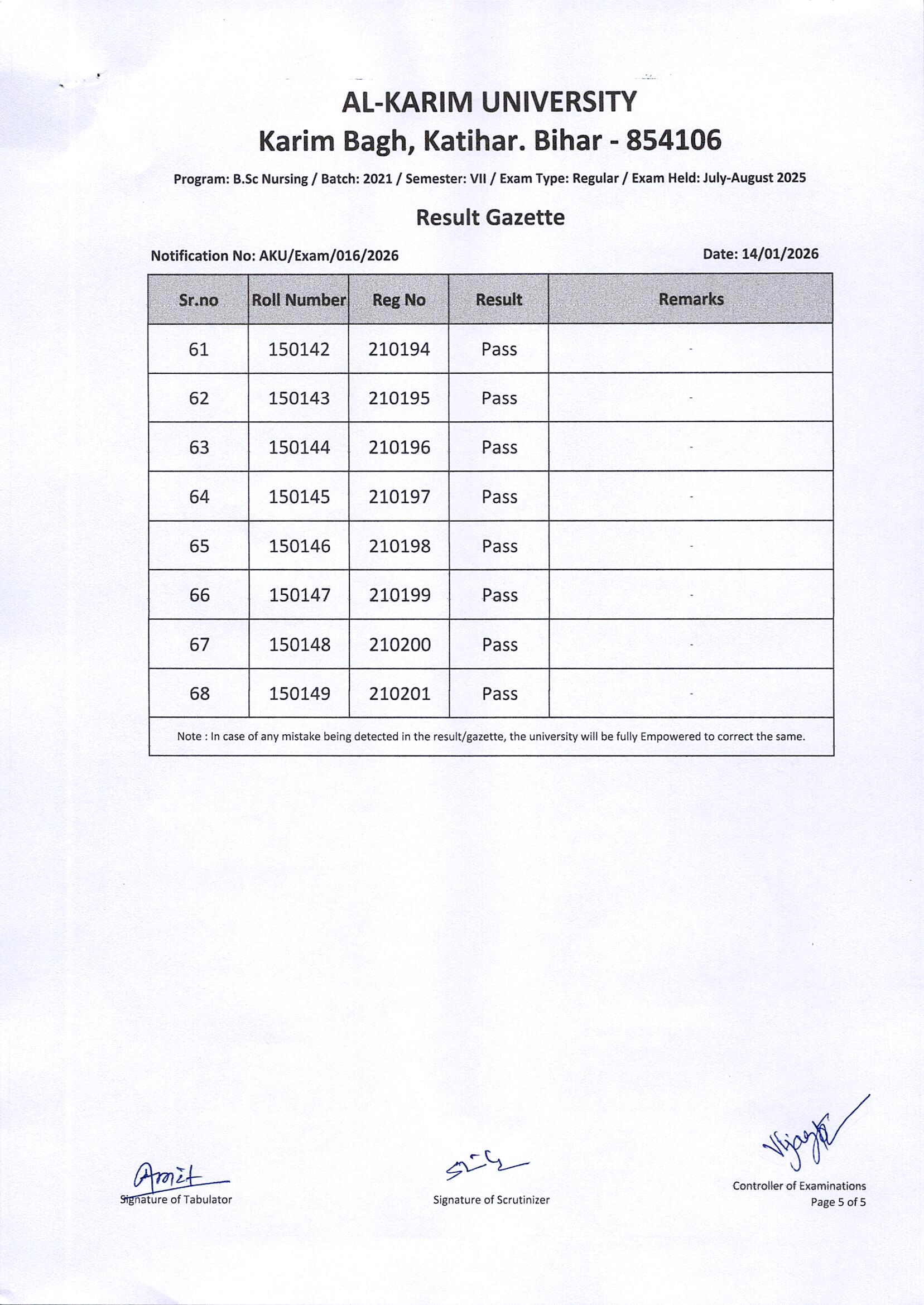 Result of B. Sc. Nursing/Batch-2021/Semester-VII Regular Exam 2025 Page 5 of 5