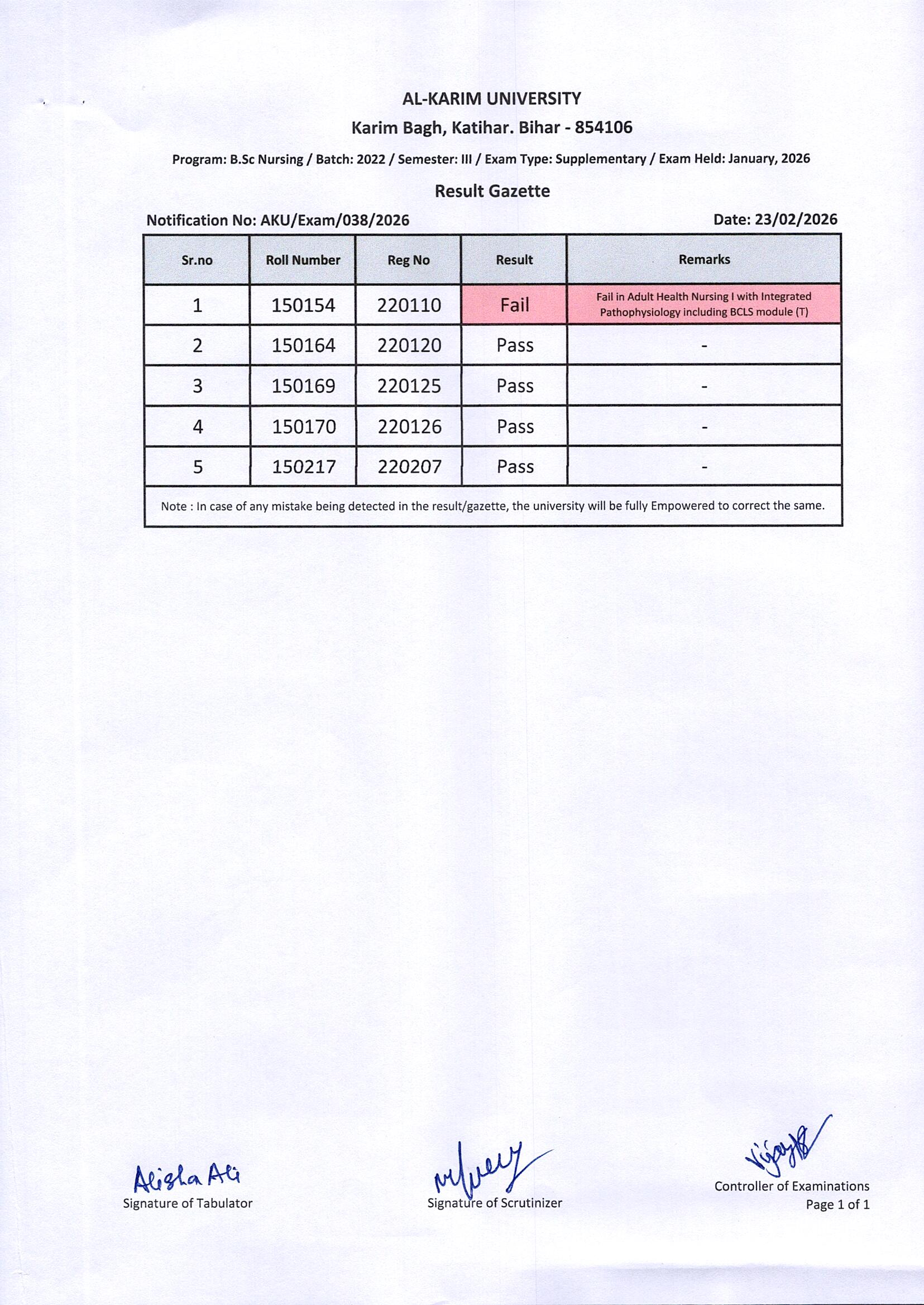 Result of B. Sc. Nursing/Batch-2022/Semester-III Supplementary Exam 2026