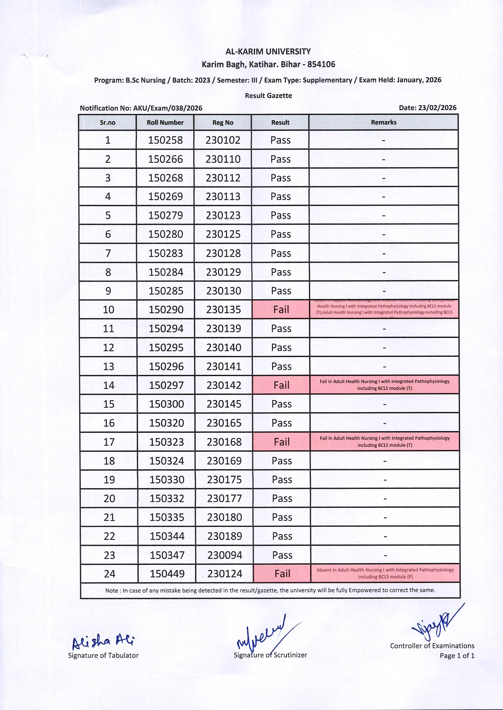 Result of B. Sc. Nursing/Batch-2023/Semester-III Supplementary Exam 2026