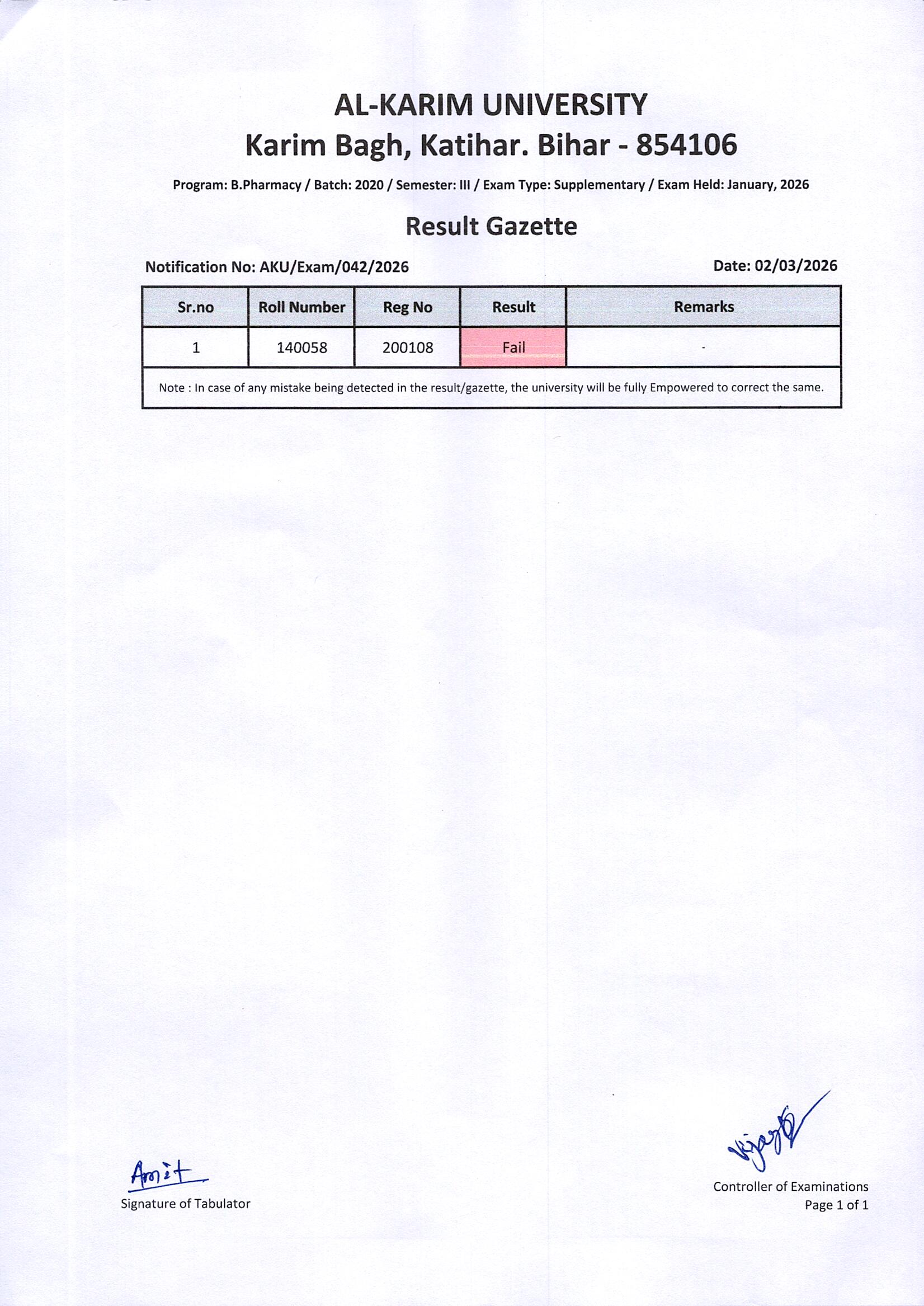 Result of B. Pharmacy / Batch-2020 / Semester-III Supplementary Examination