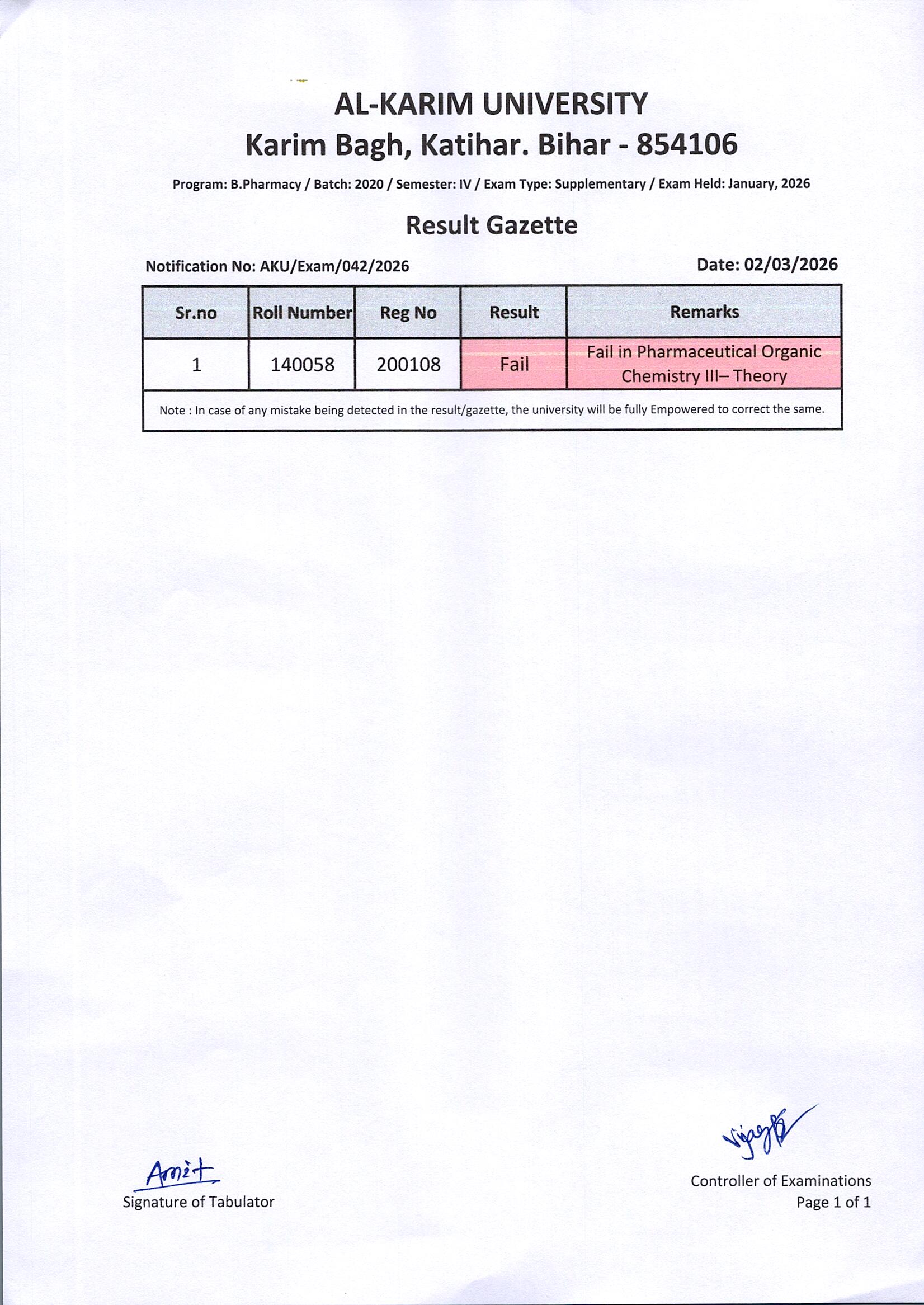 Result of B. Pharmacy / Batch-2020 / Semester-IV Supplementary Examination