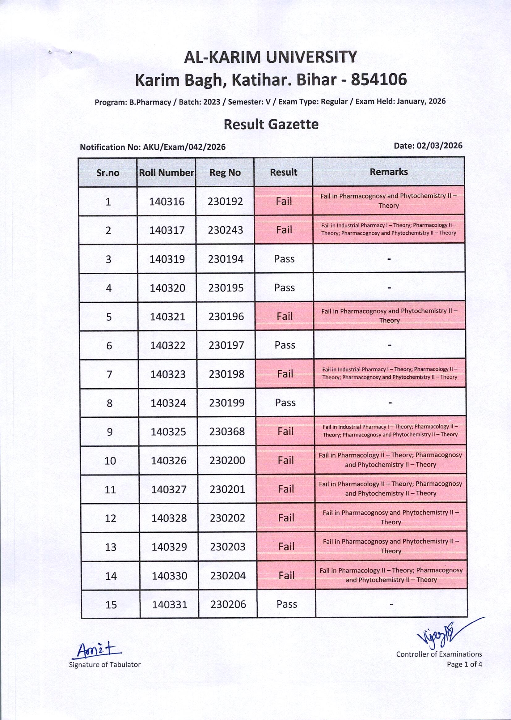 Result of B. Pharmacy / Batch-2023 / Semester-V / Regular Examination Page- 1 of 4