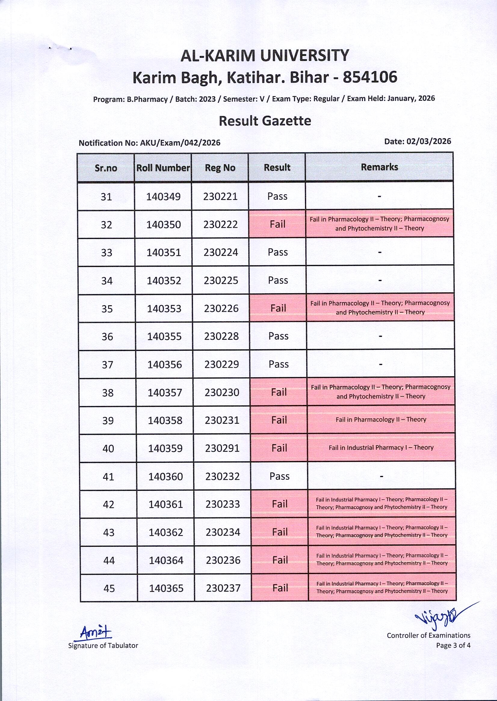 Result of B. Pharmacy / Batch-2023 / Semester-V / Regular Examination Page- 3 of 4