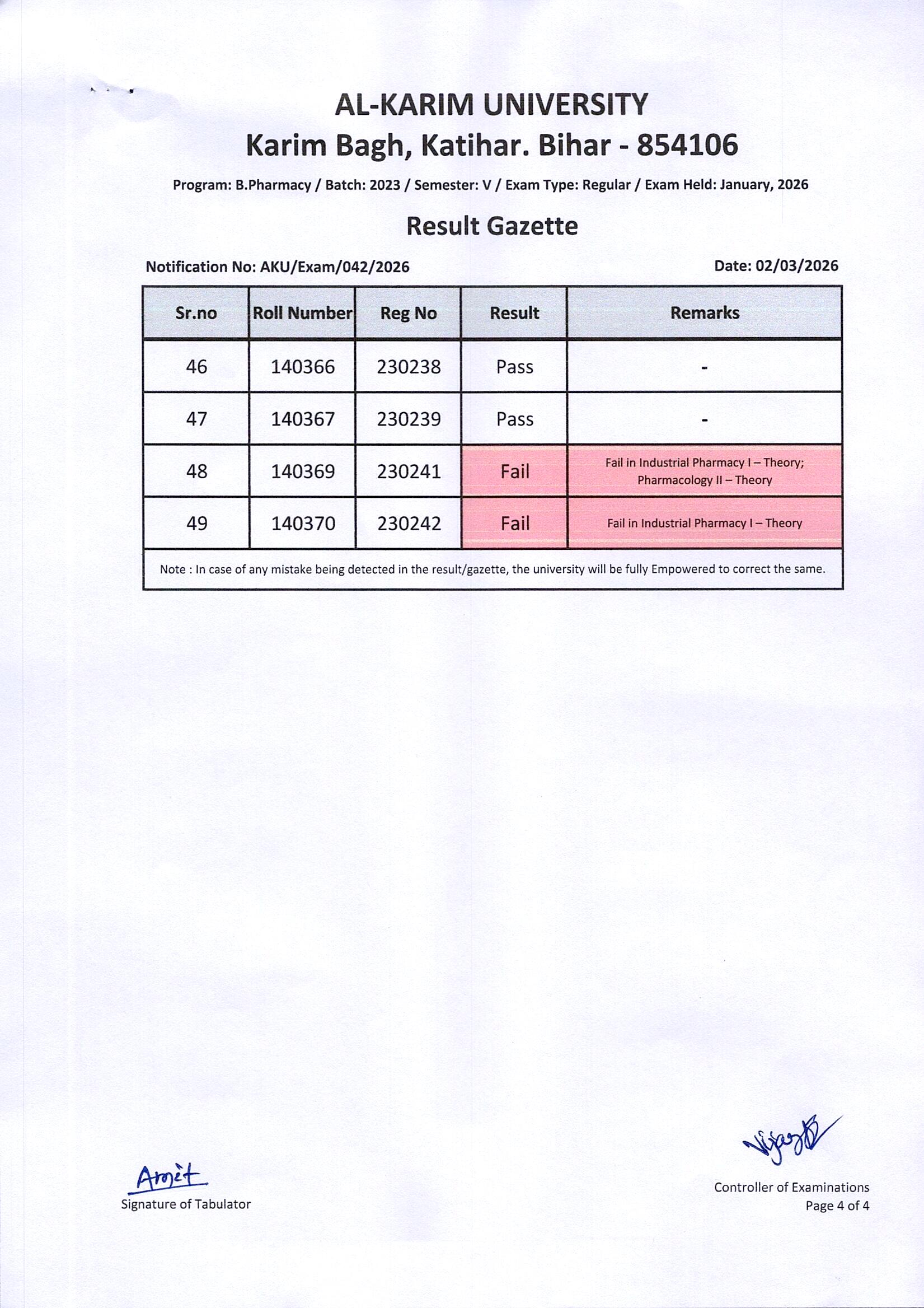 Result of B. Pharmacy / Batch-2023 / Semester-V / Regular Examination Page- 4 of 4