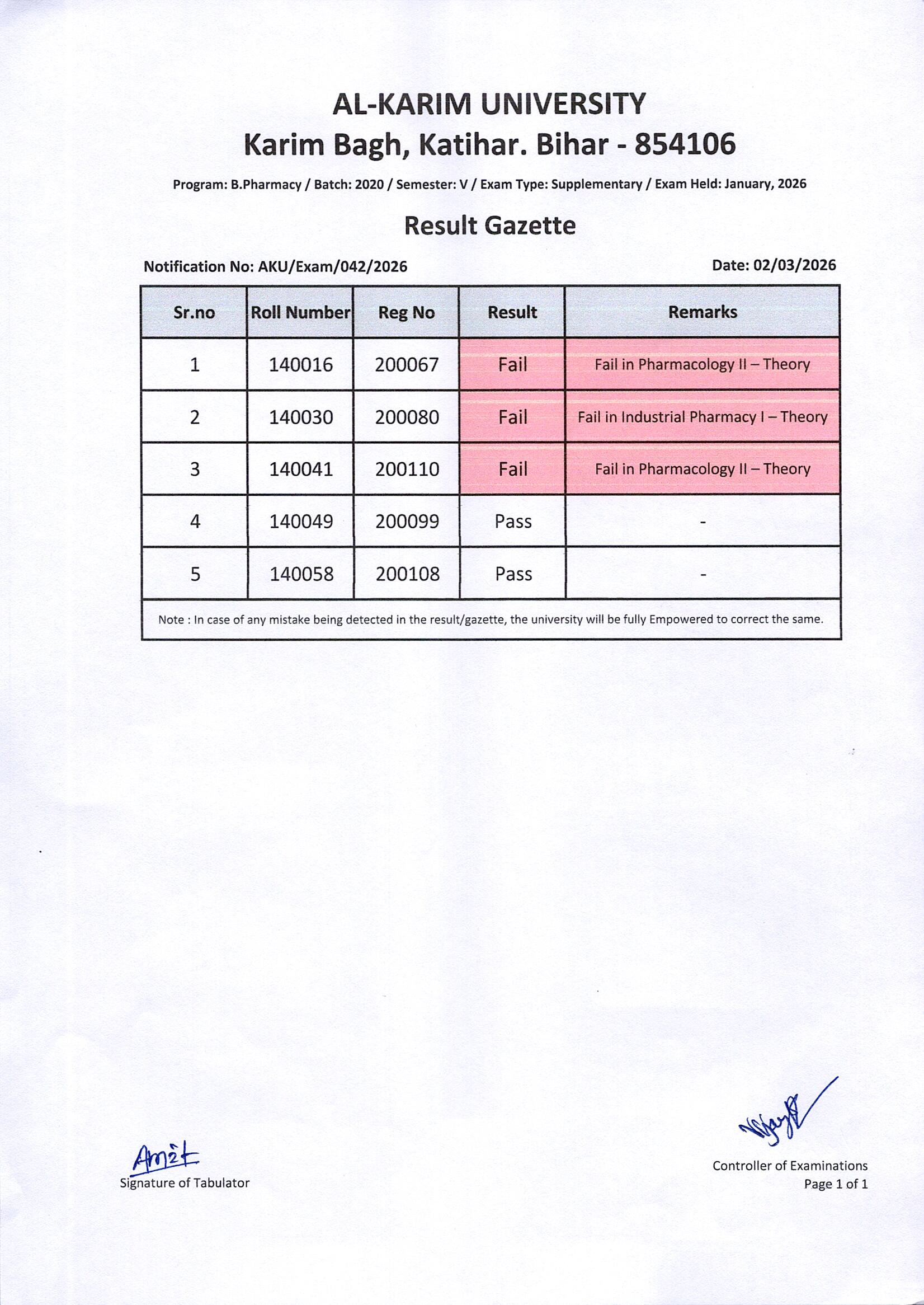 Result of B. Pharmacy / Batch-2020 / Semester-V / Supplementary Examination