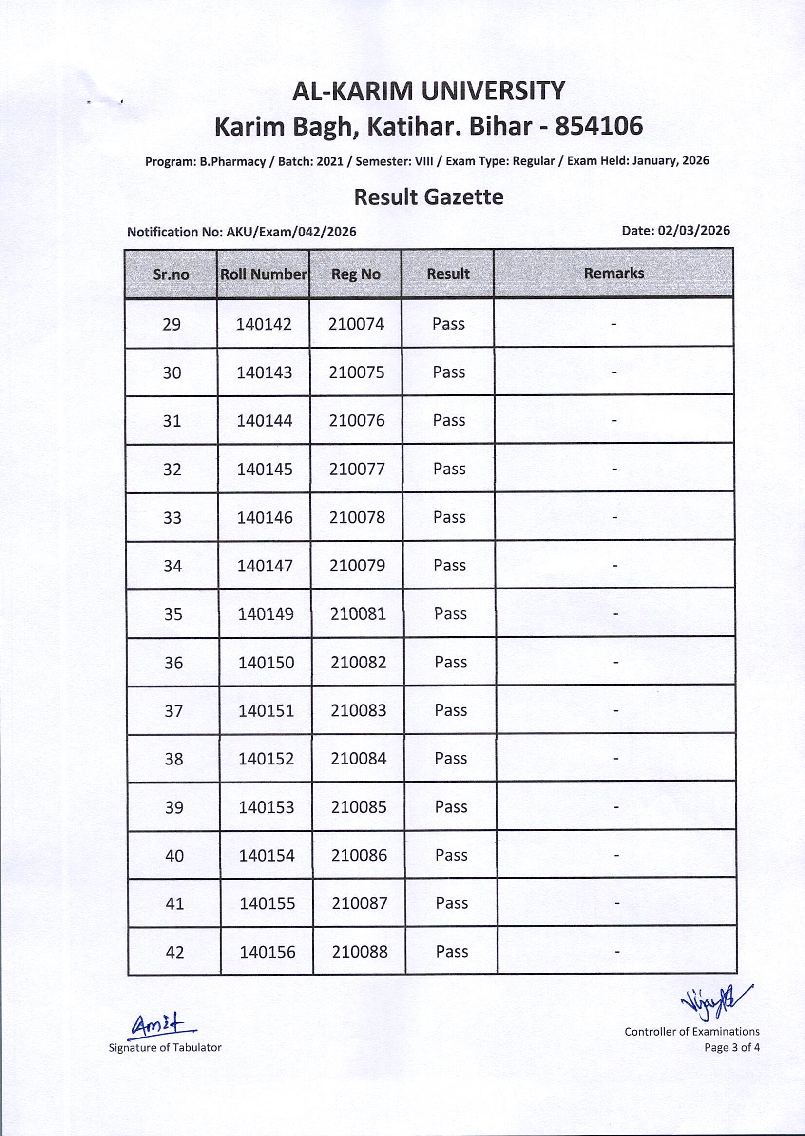 Result of B. Pharmacy / Batch-2021 / Semester-VIII / Regular Examination Page 3 of 4