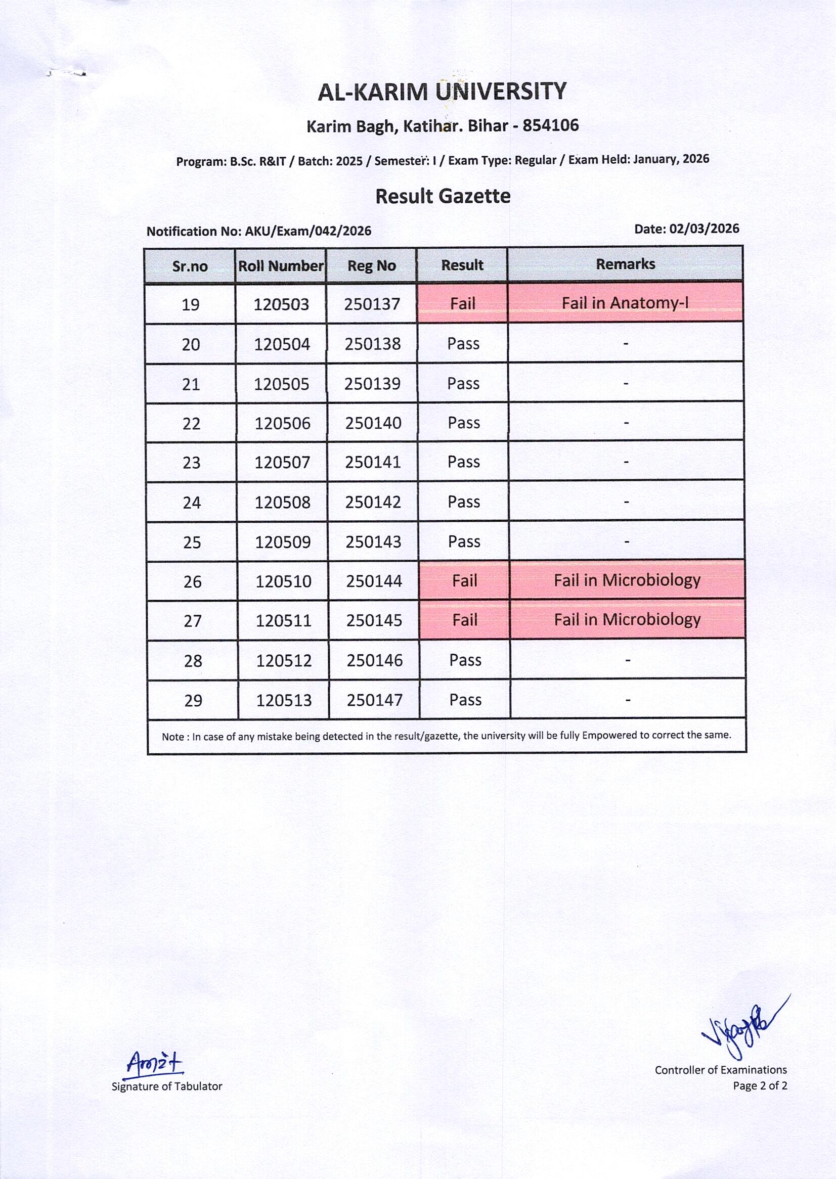 Result of B.Sc. R&IT / Batch:2025 / Semester-I /Regular Examination Page 2 of 2