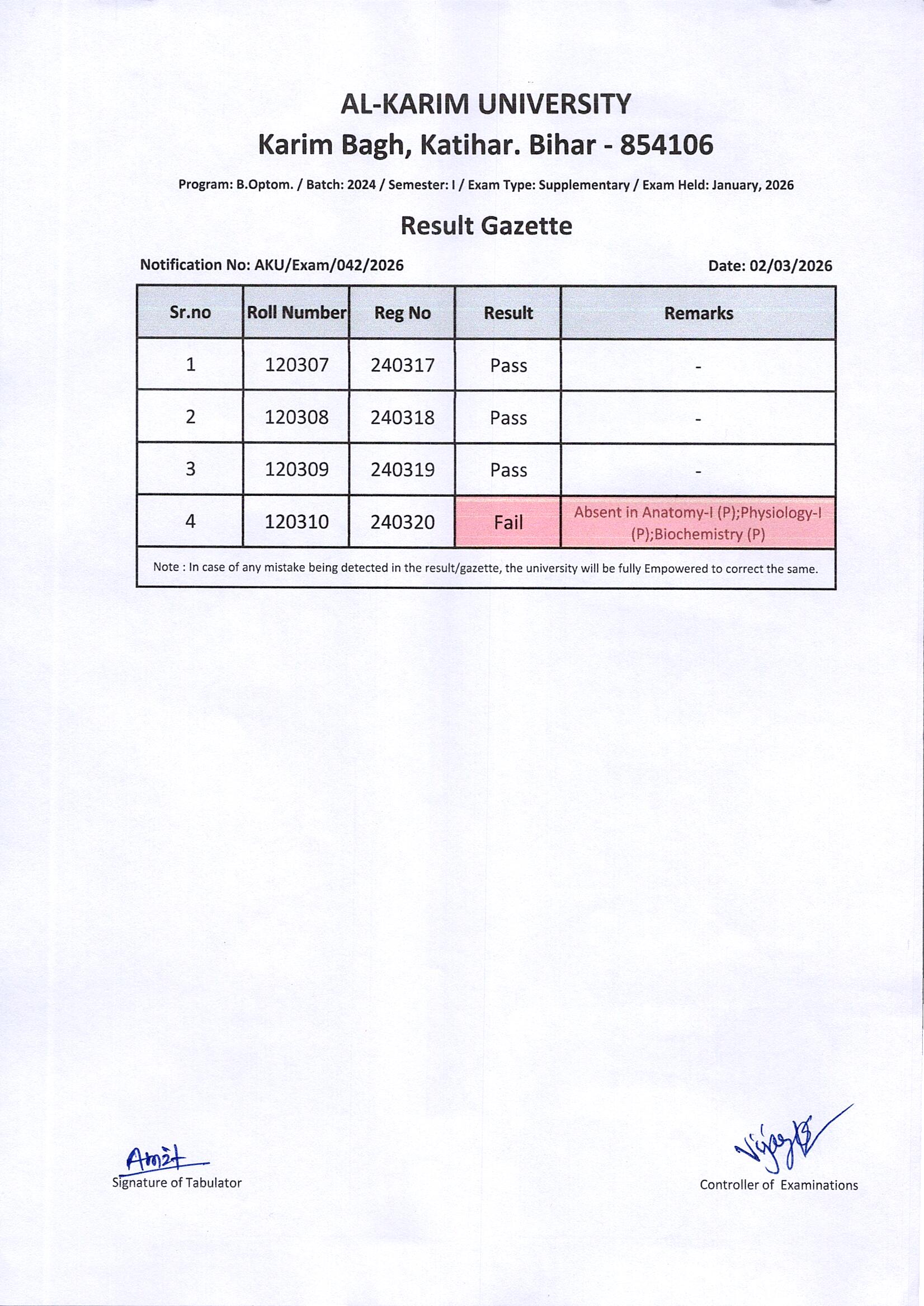 Result of B.Optom / Batch:2024 / Semester-I /Supplementary Examination