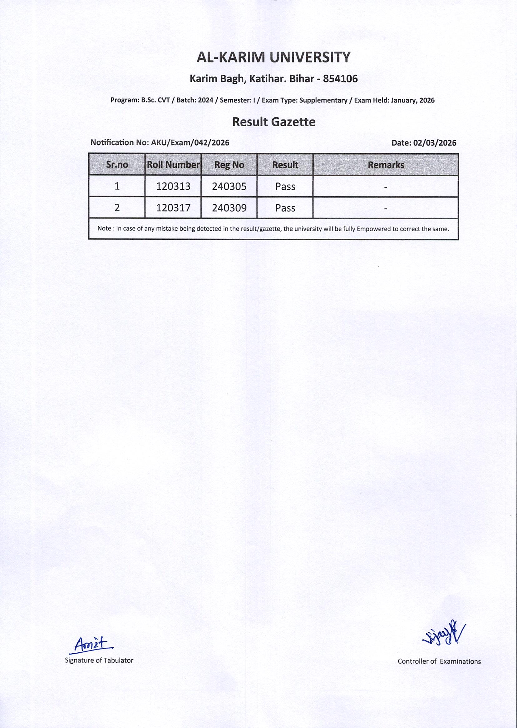 Result of B.Sc. CVT / Batch:2024 / Semester-I /Supplementary Examination