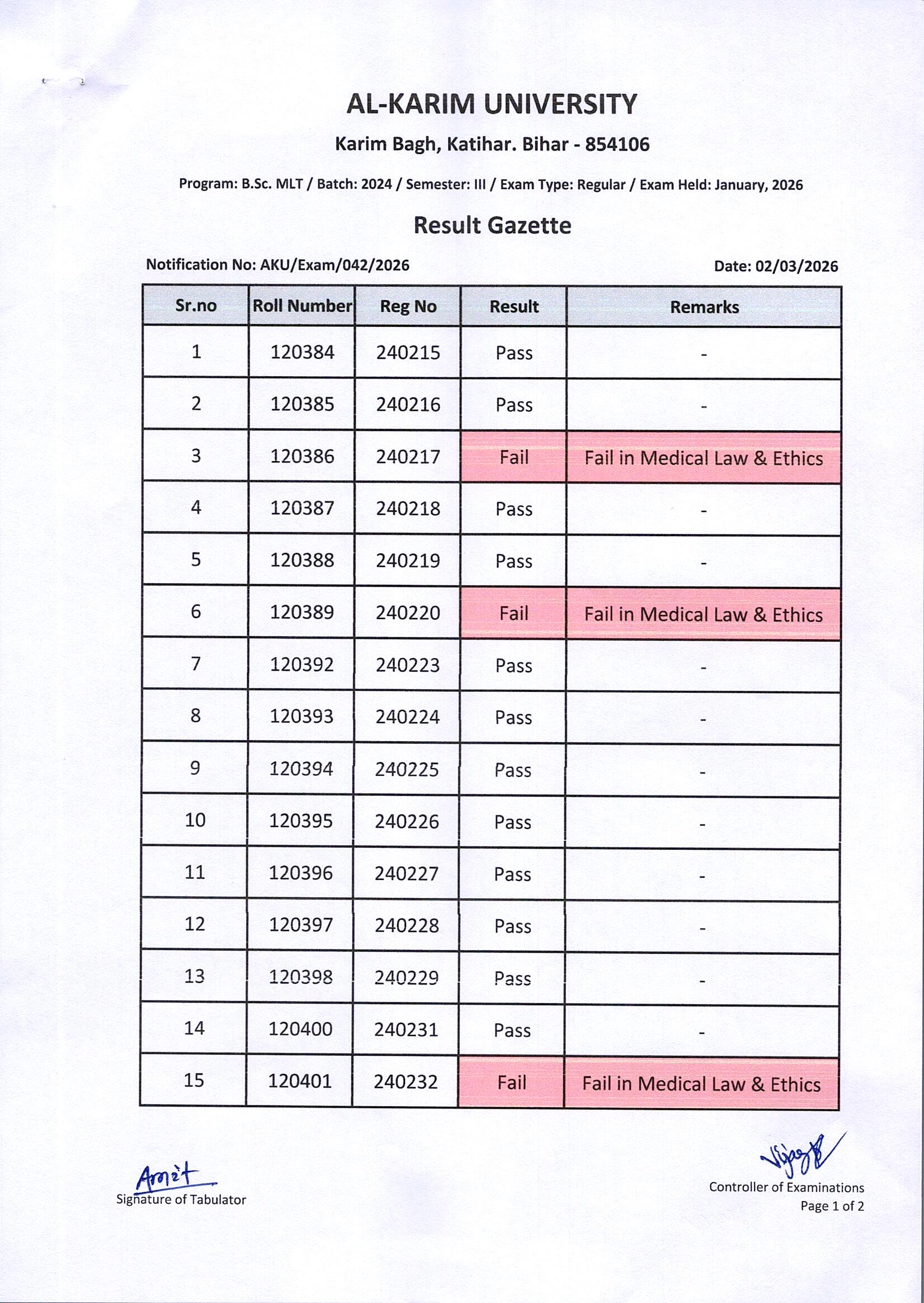 Result of BSc MLT / Batch:2024 / Semester-III / Regular Examination Page 1 of 2
