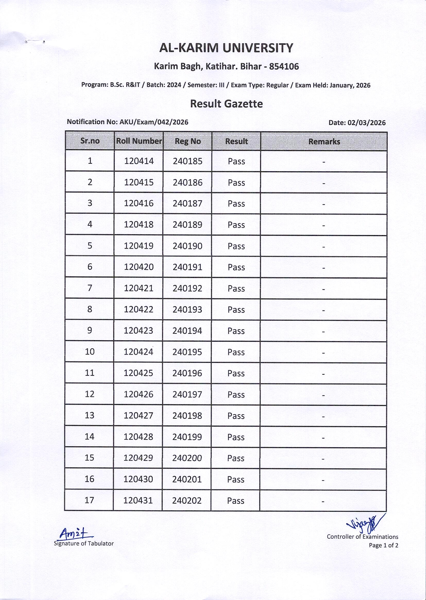 Result of BSc R&IT / Batch:2024 / Semester-III / Regular Examination Page 1 of 2