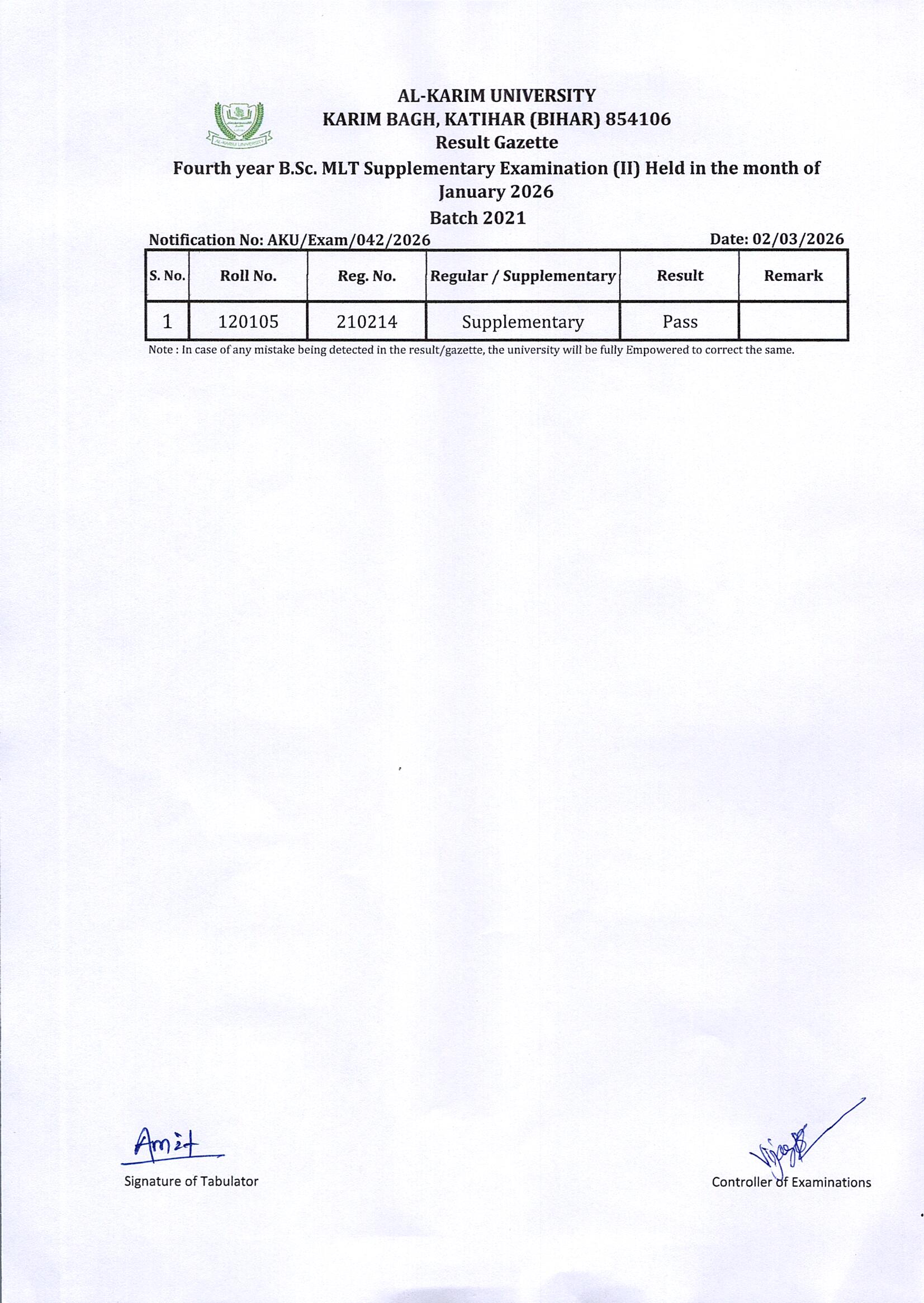Result of 4th year BSc MLT Supplementary Examination (II) Batch:2021