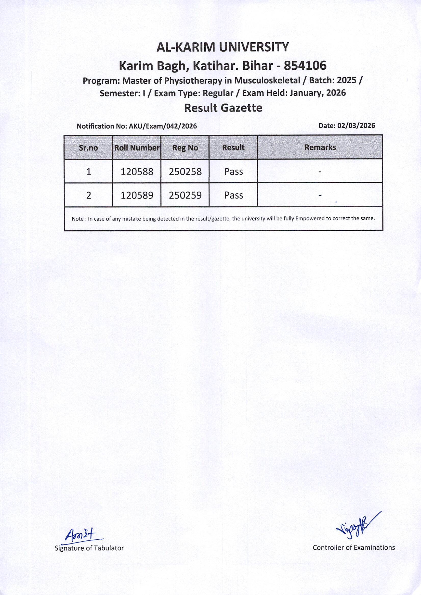 Result of Master of Physiotherapy in Musculoskeletal Batch:2025 Semester-I Regular Examination